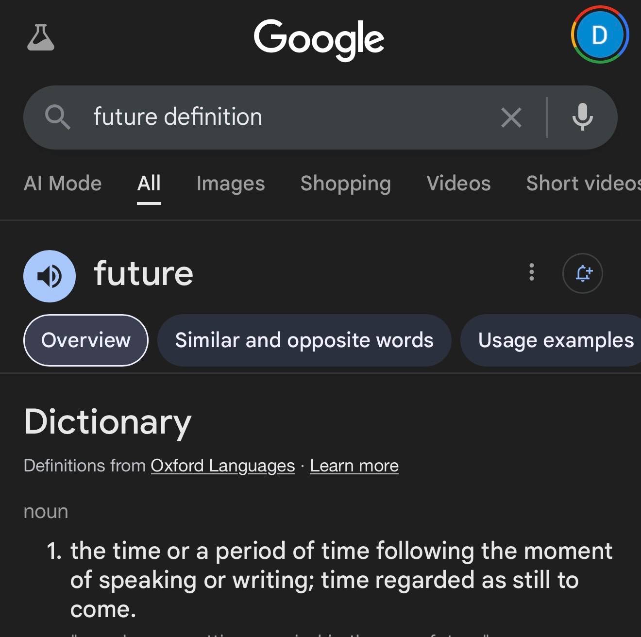 When you Google the definition of “future,” the very first result says: “The time following the moment of speaking or writing.”